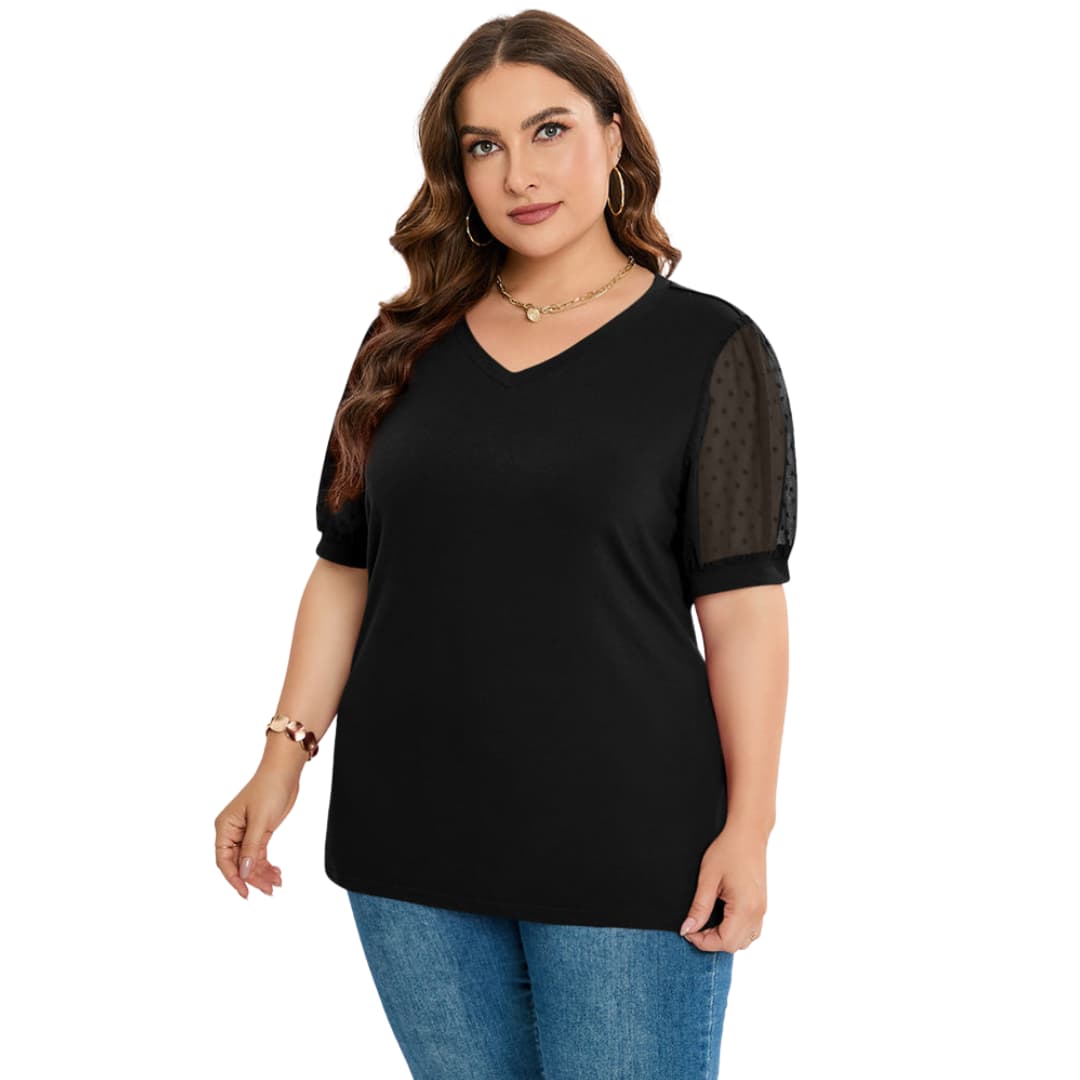 Women's summer top made from lightweight fabric suitable for warm-weather wear. Features include a V-neckline, short puff sleeves, and semi-sheer textured detailing. Designed with a feminine silhouette and constructed for ease of care. Suitable for day-to-night use and casual settings.