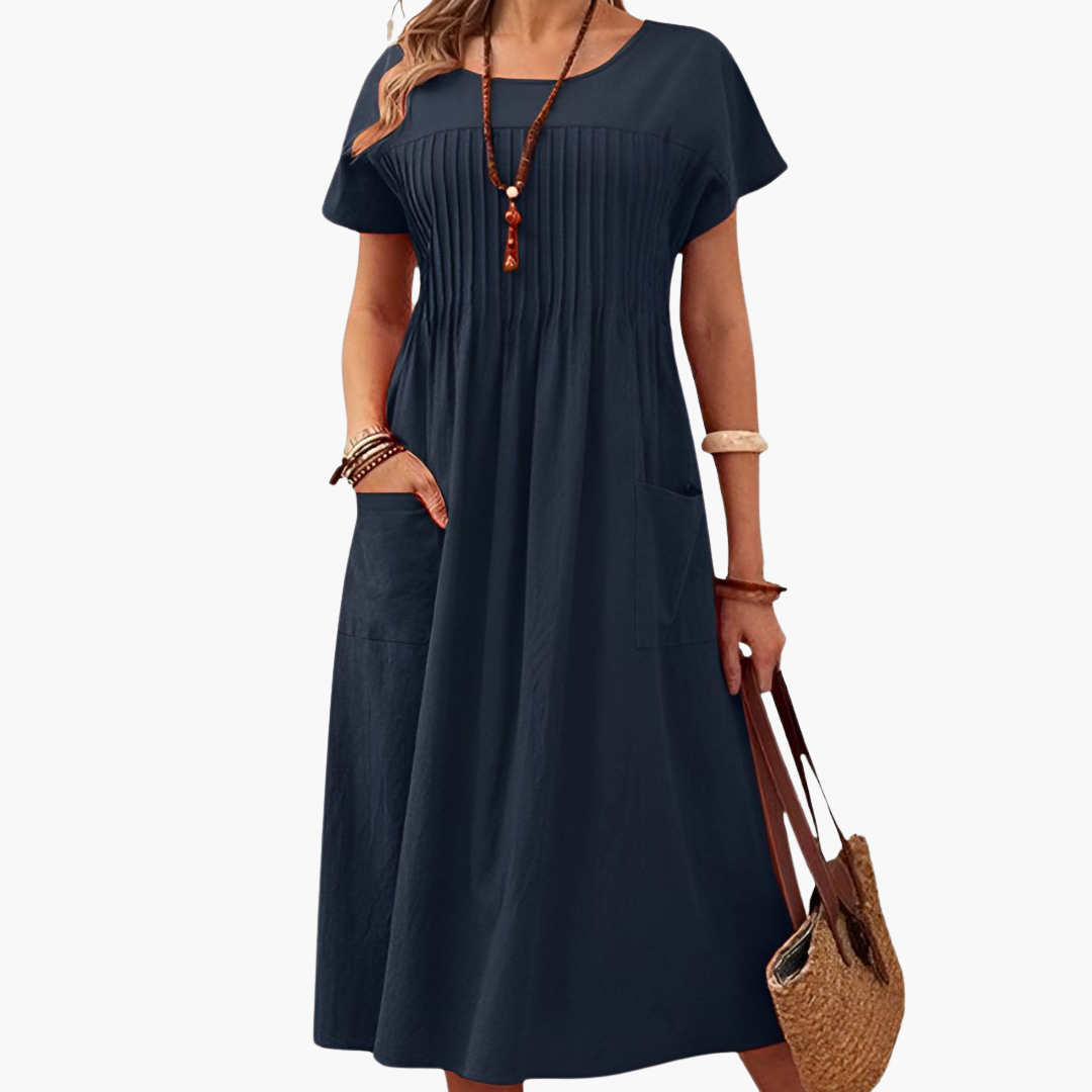 This women’s midi day dress is made from lightweight fabric suitable for spring and summer use. Designed with short sleeves, a square neckline, pleated bodice and mid-calf silhouette. Features include side patch pockets and a relaxed fit. Suitable for everyday casual wear and adaptable across various occasions.