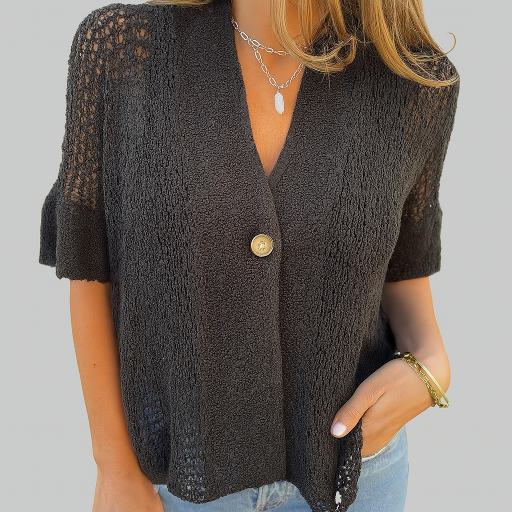 The Isalyn Lightweight Knit Cardigan is your perfect layering piece for relaxed, sunlit days. With its airy texture, soft drape, and single-button closure, it adds just the right touch of comfort and style. Designed for easy styling, it pairs beautifully with denim or dresses for a laid-back yet polished look.