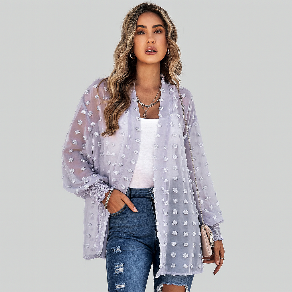 Elevate your everyday styling with the Zelitha Textured Open-Front Cardigan, a graceful piece that blends breezy elegance with timeless texture. Its relaxed silhouette flatters all figures, while the dotted finish and voluminous sleeves add subtle sophistication. From casual brunches to polished evenings, it’s your go-to for effortless layering with a stylish twist.