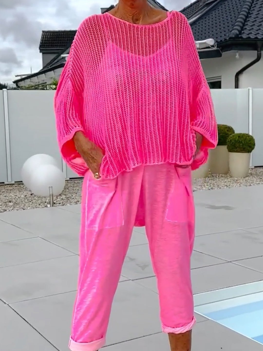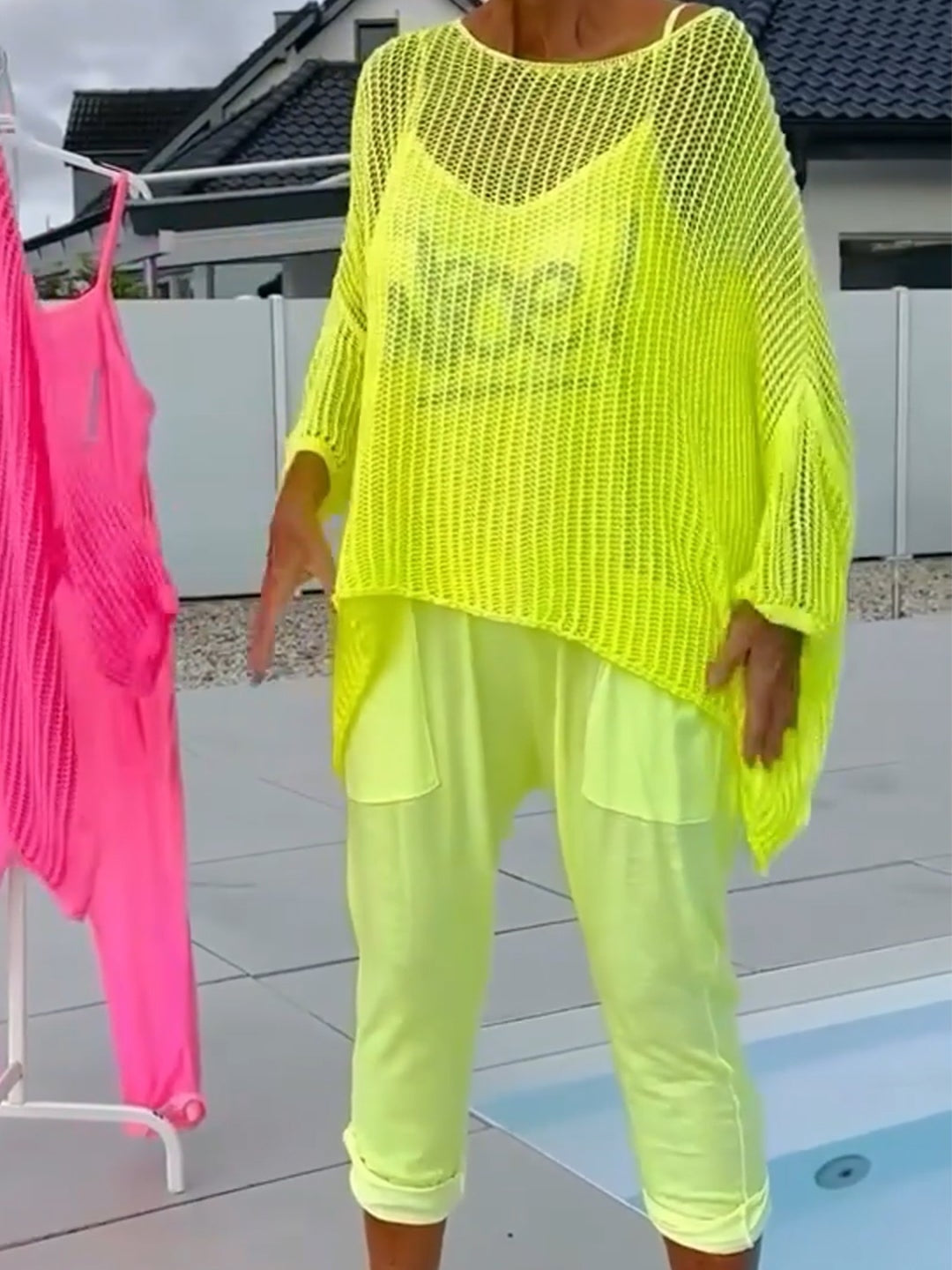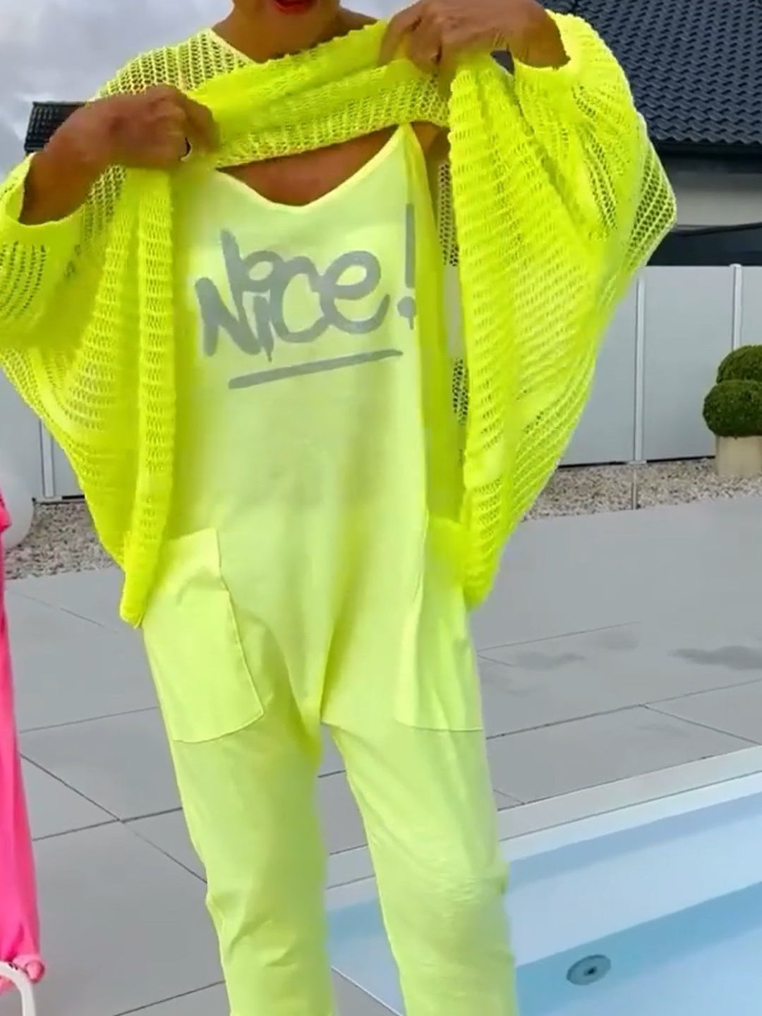 A playful yet polished two-piece ensemble that blends urban edge with resort-ready ease. The graphic letter-print jumpsuit offers streetwise flair, while the breezy cover-up adds a touch of effortless sophistication—perfect for transitioning from beachside lounging to city exploring.
